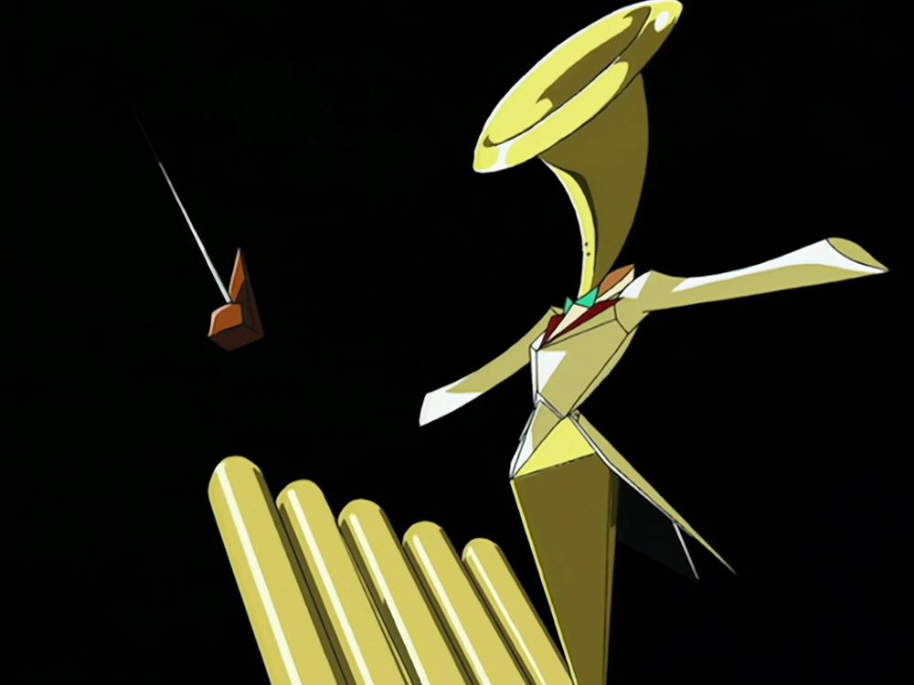 Percurio is the counterpart of Mic Sounders the 13th. He is a lean humanoid with a horn as his head dressing in tuxedo accompanied by a floating metronome that is constantly in motion. He rides a giant whale-like machine made out of musical instruments called BluBalloon. He battled Mic in London in Repli-England.