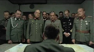 | “ | Krebs: The enemy has broken through along a wide front. They've taken Zossen to the south and are advancing to Stahnsdorf. They're on the northern outskirts between Frohnau and Pankow, they've reached Lichtenberg, Mahlsdorf and Karlshorst to the east Hitler: Steiner's assault will bring it under control. Krebs: (anxious) My Führer, Steiner... Jodl: Steiner couldn't mobilize enough men. He wasn't able to carry out his assault. Hitler: (expression remains exactly the same for a few seconds, pulls glasses shakingly) These men will stay here: Keitel, Jodl, Krebs and Burgdorf. (Everybody exits except for the aforementioned generals, as well as Goebbels and Bormann) THAT WAS AN ORDER! STEINER'S ASSAULT WAS AN ORDER! Who do you think you are to dare disobey an order I give?! So this is what it has come to... The military has been lying to me! Everybody has been lying to me, even the SS! Our generals are just a bunch of contemptible, disloyal COWARDS! Burgdorf: My Führer, I can't permit you to insult the soldiers! Hitler: THEY ARE COWARDS! TRAITORS! AND FAILURES! Burgdorf: My Führer, this is outrageous! Hitler: Our generals are the scum of the German people! (throws pencil on his desk) NOT A SHRED OF HONOUR! They call themselves generals! Years at military academy just to learn how to hold a KNIFE AND FORK! For years, the military has hindered my plans! They've put every kind of obstacle in my way! And what I should have done... was liquidate all the high-ranking officers, JUST LIKE STALIN! (sits down) I never attended an academy, and yet, (thumping his chest) I have conquered Europe all by myself. Traitors! I've been betrayed and deceived from the very beginning! What a monstrous betrayal of the German people... but all those traitors will pay. They'll pay with their own blood. THEY SHALL DROWN IN THEIR OWN BLOOD! Traudl: (outside, with a crying Gerda) Oh Gerda, please calm yourself... Hitler: (calms down sadly) My orders have fallen on deaf ears. Under these circumstances, I am no longer able to lead. It's over. The war is lost. But gentlemen, if you believe I am going to leave Berlin, you are seriously mistaken. I'd rather blow my brains out. Do what ever you want. |