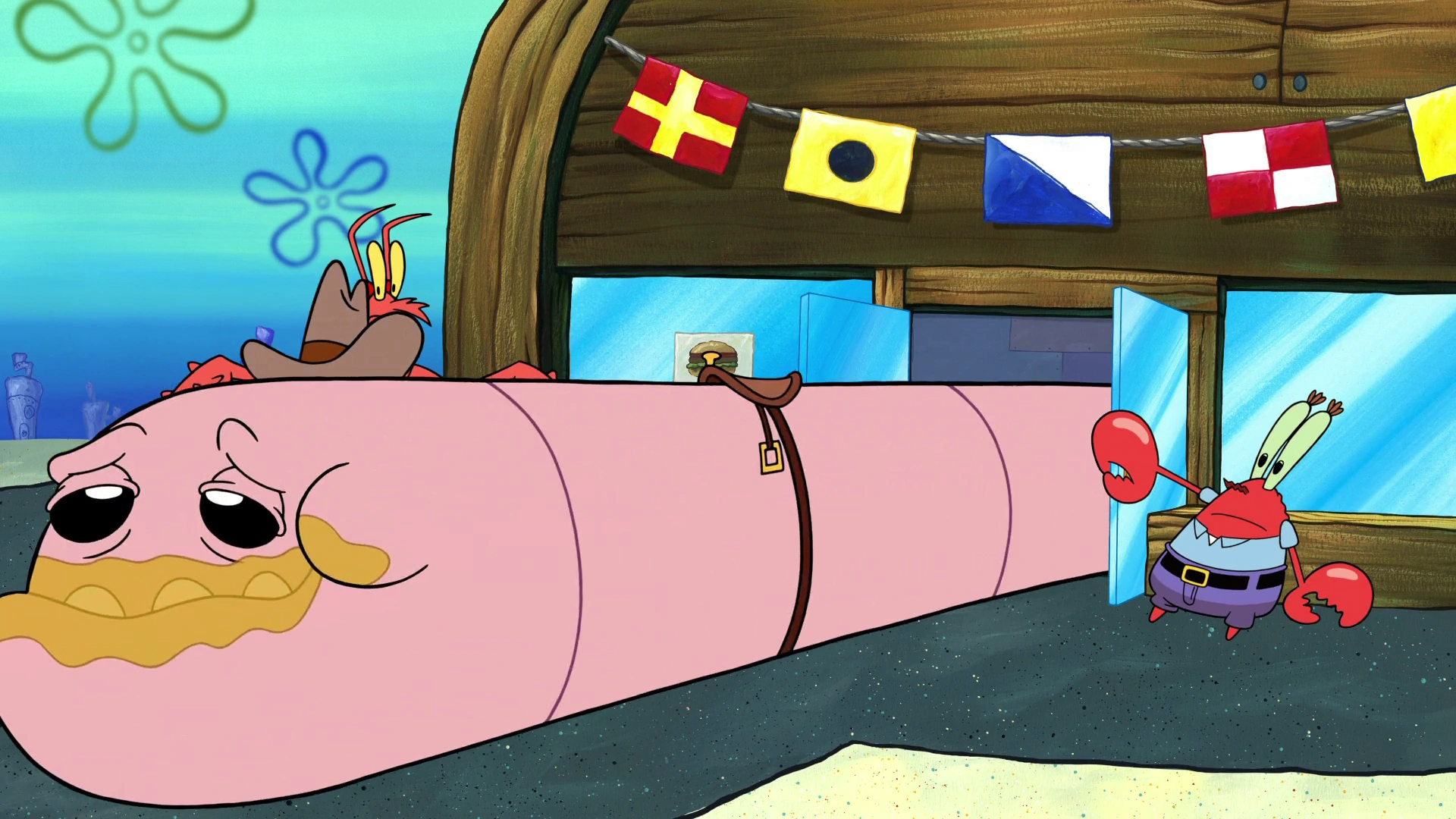 An Alaskan Bull Worm domesticated by Sandy exiting the Krusty Krab.