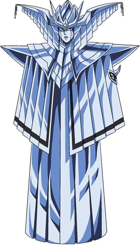 Albinass is a human-shaped, silvery, metallic construct, looking like a beautiful woman clad in an encompassing cloak covering and concealing her entire body, large, pointed shoulder-pads, and an elaborate crown, with two points on each side of her head.