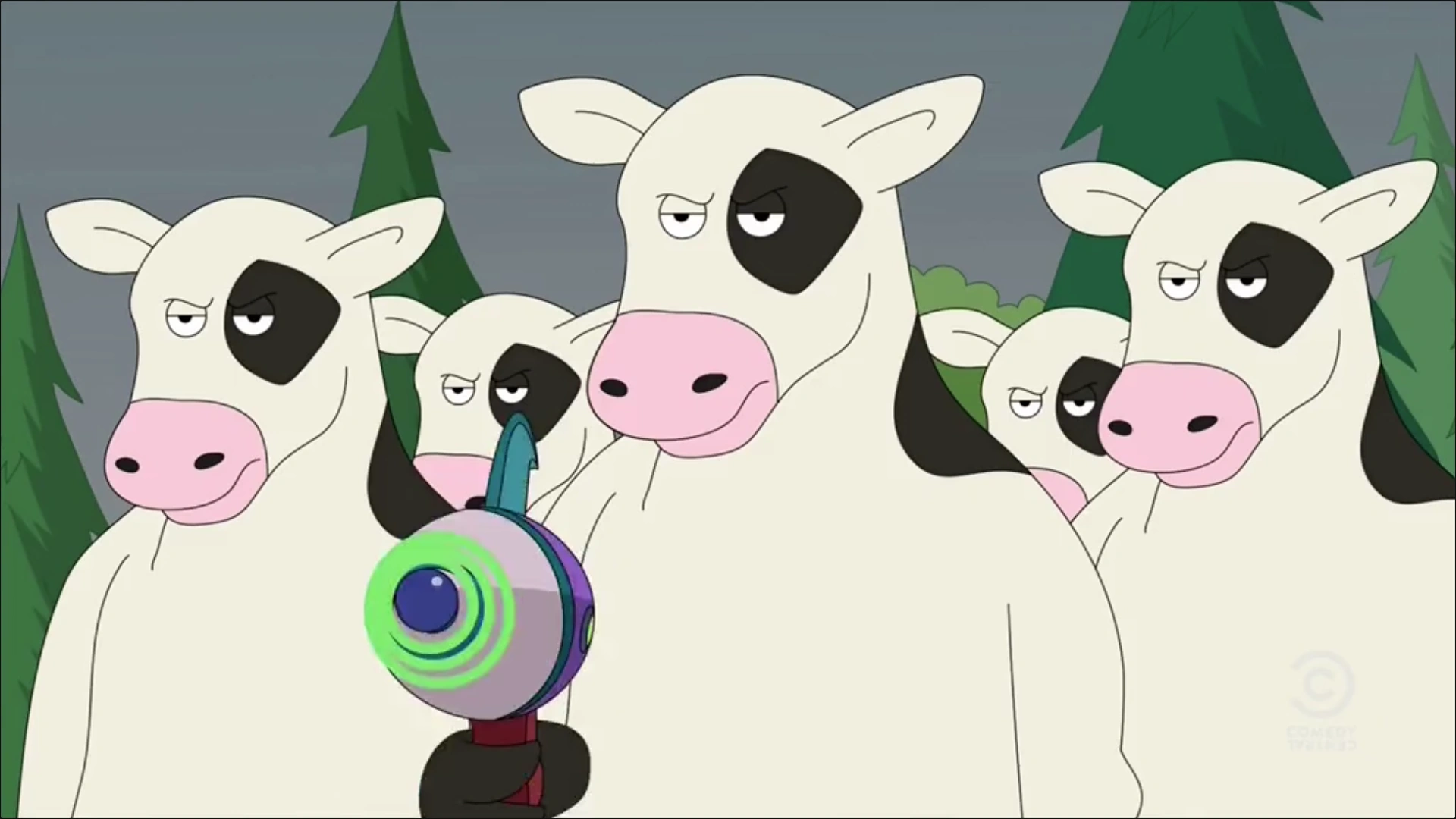 Alien Cows are a species of one-time villains from the Comedy Central animated series Brickleberry, as well as the main villains of the Brickleberry comic book franchise "Armoogeddon". They are a herd of alien cows who came to Earth to take over after global warming destroyed the planet, thanks to their constant farting.