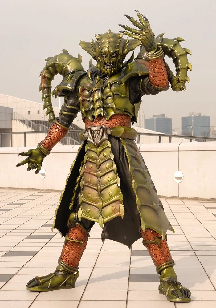 The Alligator Imagin is one of Dai-Shocker's Great Commanders. When Dai-Shocker and Dai-Zangyack reveal their alliance and fight against the combined Super Sentai and Kamen Rider force, Alligator Imagin, alongside Long of Genjuken, is seen leading a group of Imagins, to fight against the Gekirangers and Kamen Rider Den-O. He was also seen fighting Kamen Rider Agito in the second aerial attack scene.