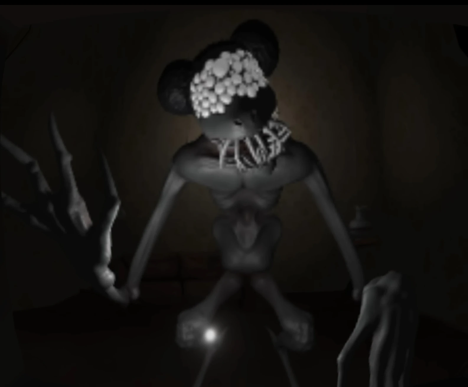In the final tape, Amanda is standing, grinning as a pile of wool is laying on the ground next to her. She states that it’s getting late and it’s time to go home, getting more desperate as she points to the house. She then asks to knock on the door, erasing any windows as she demands to be let in. After knocking, she grins and glitches out, the text on screen getting rapid as a demonic voice is heard, and the game ends as the screen cuts to Amanda transformed into her monster form, seemingly now inside the player’s house.