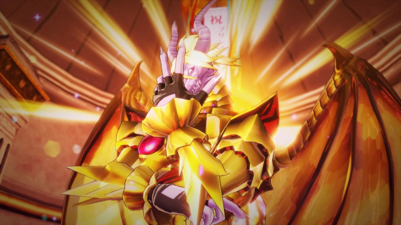 For the boss battle, Ango transforms further into a Western-style dragon clad in golden armor. His tail ends in a fountain pen nib, which he employs in several of his attacks. His wings are formed from sheets of paper, and as the fight progresses, his armor gradually breaks apart, exposing pale scales and leaving him in just red undergarments.