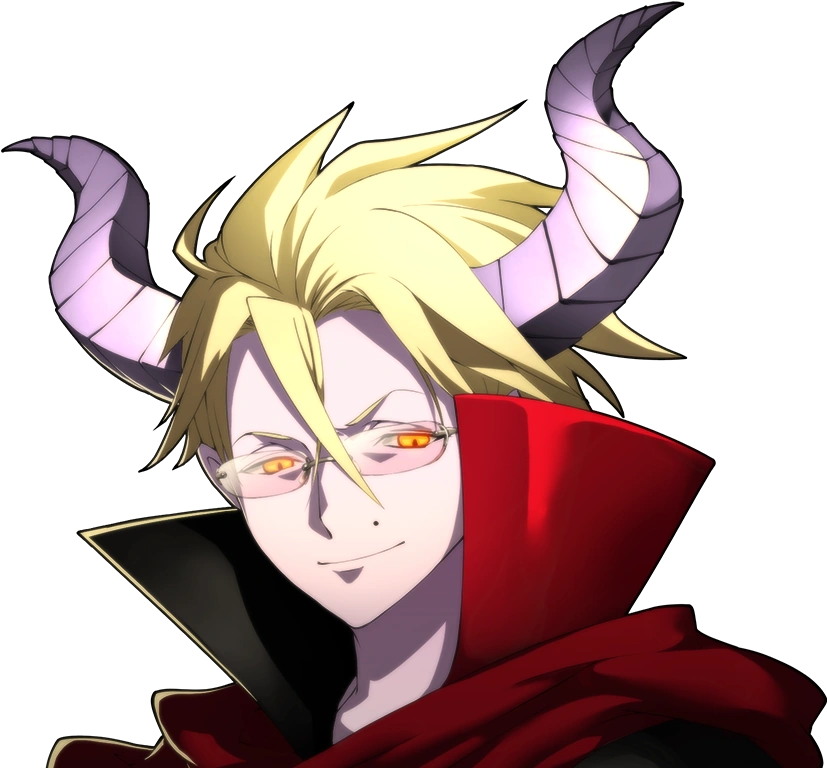 In his Monarch form, Ango’s appearance changes dramatically. His skin turns a pale lavender tone, his chin becomes more angular, his hair shifts to spiky blonde, and two massive horns curve around his head, which serve as his crown and symbolize his control over the jail—when destroyed, they release the Desires he has imprisoned. He wears only red shorts beneath a cardboard “demon king” cutout costume, a fact hidden until the cutout falls away after his defeat.