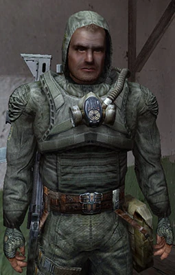 Arnie is a man in his early 40s with white stubble facial hair wears a widely-used among Loners Sunrise Suit, consisting of light military bulletproof vest and a jumpsuit made out of rubberized fabric with the gasmask on his chest. It is reinforced with inserted kevlar plates and provides low levels of protection.