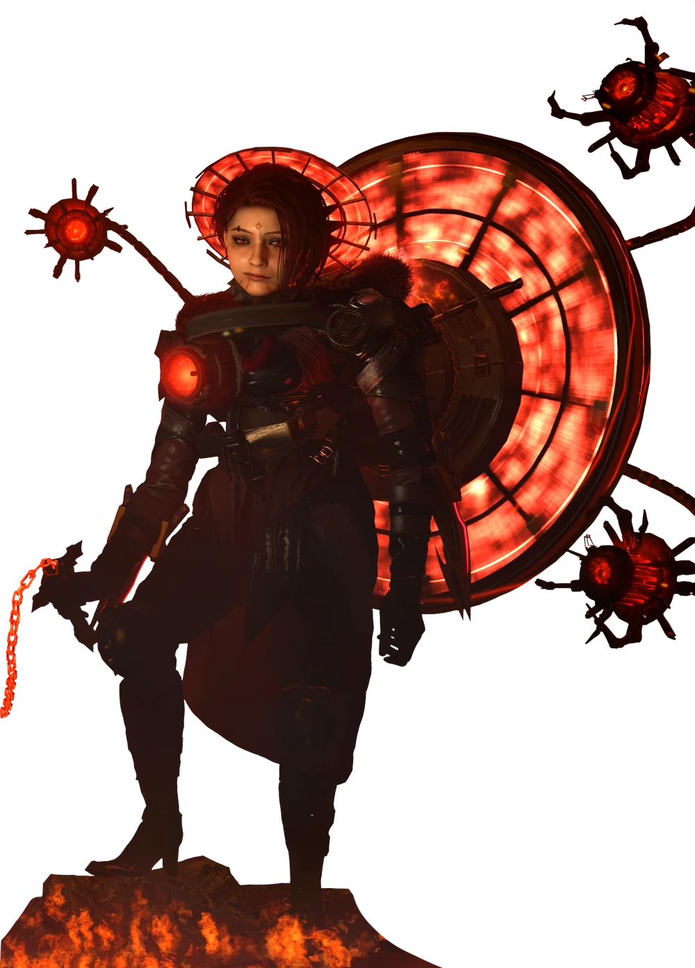 In her Titan form she has the same features as her previous form, however, she is now equipped with a titan-like body, standing at over 70 meters tall, and a large energy-emitting halo on the back, constantly seen spinning. Coming out from the back of the halo are her four Mechanical Tentacles. She's also equipped with a massive red energized chain-whip.