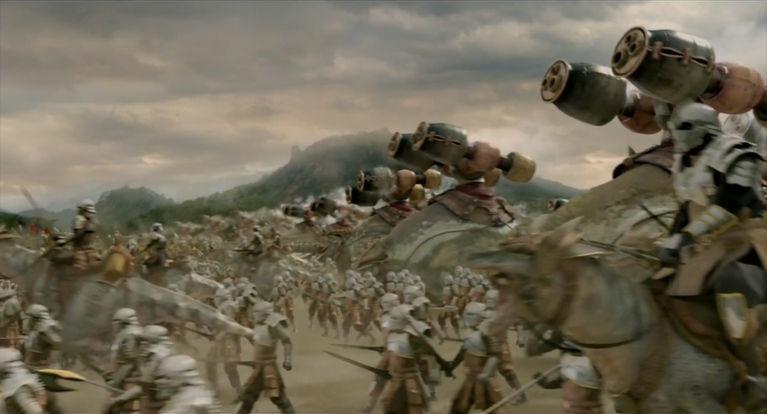After Buraki is forced to retreat when he is injured after helicopters shoot him down from the U.S. Bank Tower, the Atrox Army invades the city. The army, consisting of immense, slow-moving reptiles carrying rocket-launchers on their backs, identified in the dialogue as "Dawdler"; dinosaur-like cavalries called "Shaconne"; and small, winged Western flying dragons called "Bulco", proceed to duke it out with an army of modern soldiers, tanks and helicopters in the middle of Los Angeles. A dramatic chase ensues, full of monsters and explosions. Despite humanity's more advanced technology, the Atrox Army gains the upper hand and wipes out the military.