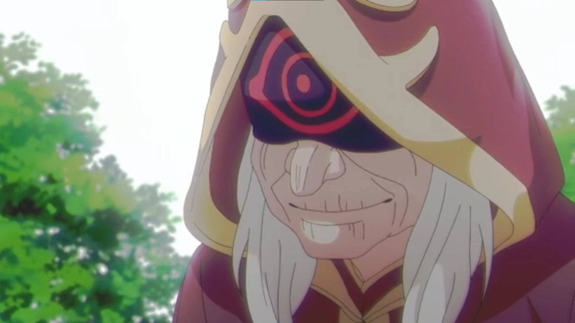 Ayako appears as an eldery woman with her eyes covered by a fabric with a red circle at the center. Like a typical witch, she has a long nose and frail-looking body. She wears a red hood that covering her head with a golden face-like design at the front.