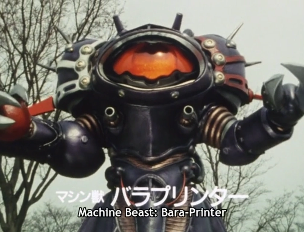 Bara Printer is the Camera and Printer-themed Machine Beast of the Machine Empire Baranoia serving Empress Hysteria and a minor antagonist in Chouriki Sentai Ohranger. He is a cameo antagonist in the 8th episode, the main antagonist of the 11th episode and a supporting antagonist in the 33rd.