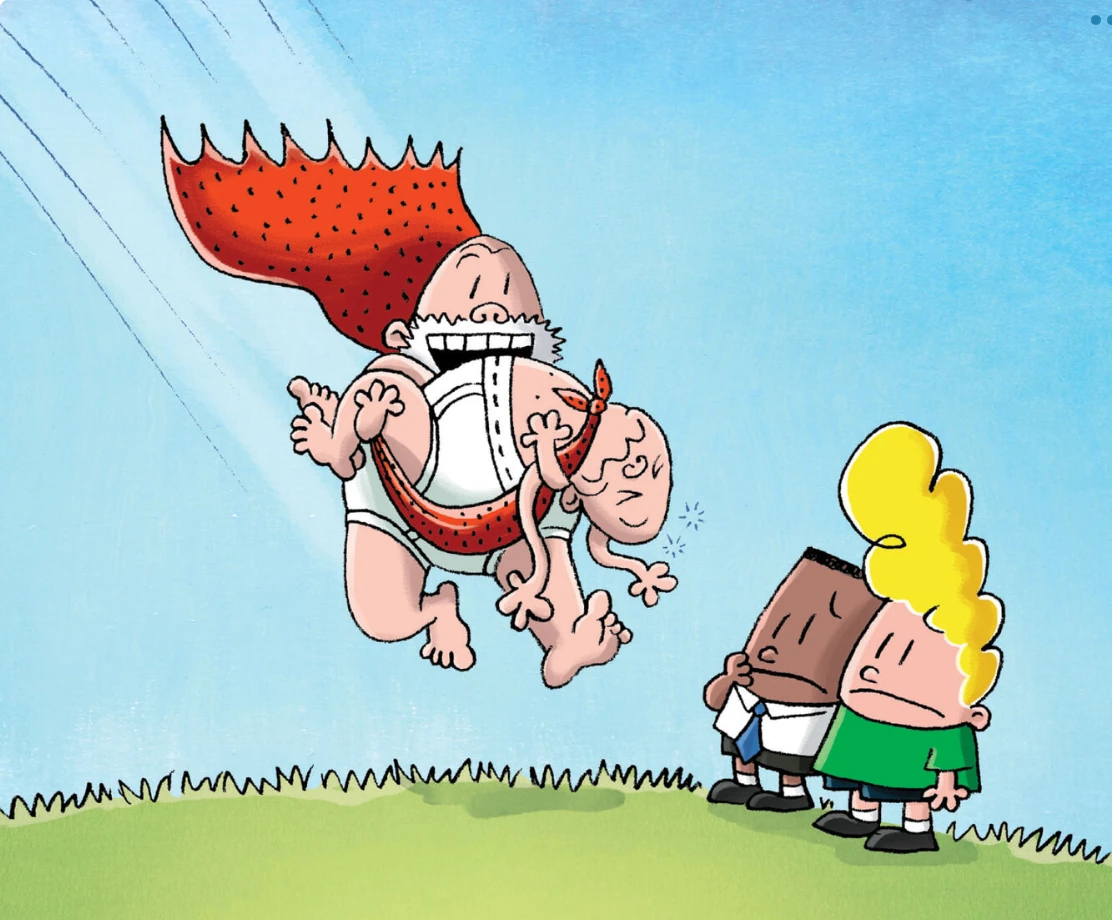 Toilet paper does not hold as expected. However, George and Harold's weight flattens the cloak, causing it to act like a parachute, allowing them to slowly fall down. As they approach the roof of the school, Captain Underpants is caught in the Deliriously Dangerous Death-Defying Dandelion of Doom while George and Harold land on the roof of the school. Hoping to save him, they reluctantly decide to give him superpowers. The next time the Dandelion of Doom gets around him, he uses his newly acquired superpowers to easily defeat the garden beast.