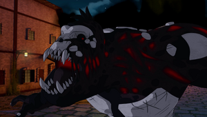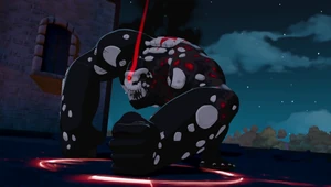 Believing Ruby to be dead, the Beringel jumps back down to the ground and pounds its chest and roars in victory. It then notices the rose petals in the church building Ruby fell into and roars in anger and confusion before Ruby bursts out from a window, evades its attacks, trips it up, and launches it into the sky with her Semblance. She then stabs it in the chest, bringing it back down, before firing one last shot into its head and killing it.