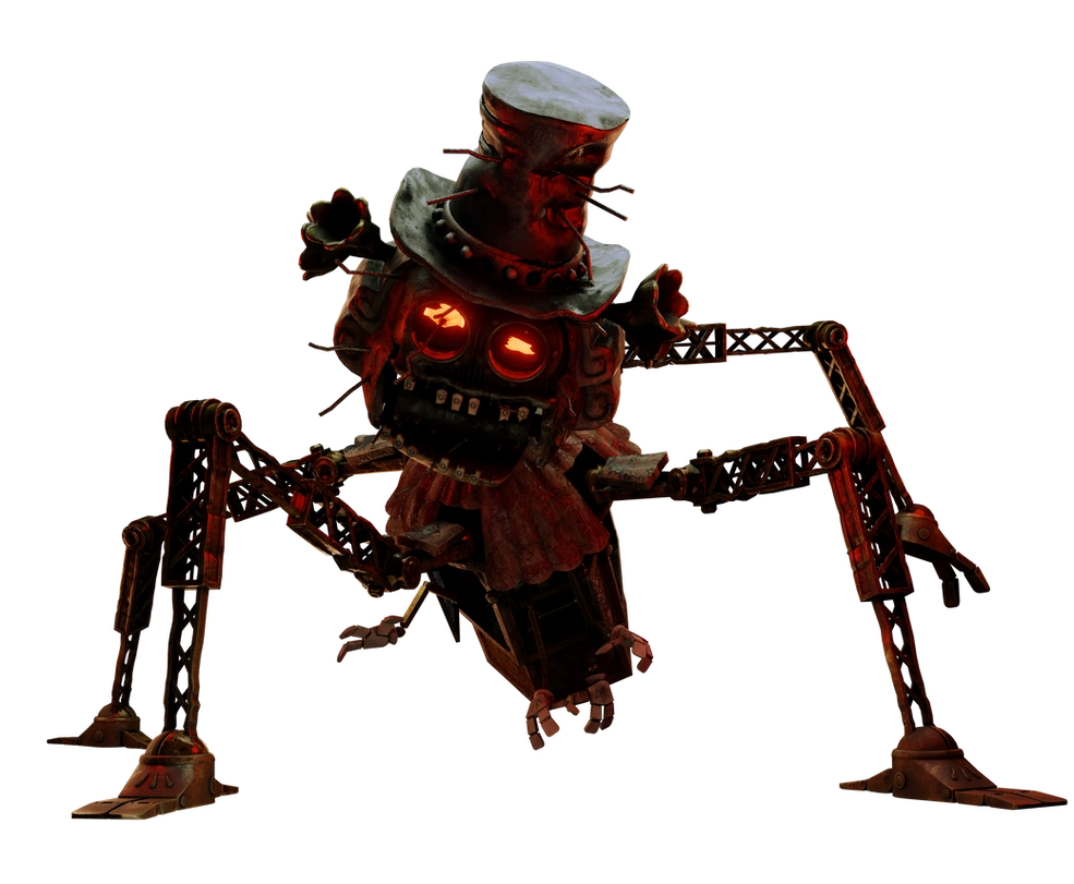 Big Top is a large spider-like animatronic, similar to DJ Music Man. He has bright, glowing yellow eyes, with what seems to be shutters over them, a large orange nose, white hair and mustache, and two gramophones on both sides of his head. He wears a hat with yellow lights going around the base. The inside of his mouth is a music box cylinder, with his teeth being the comb that plays music. His body is pink with an openable hatch with four extra, smaller arms in it.