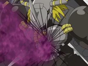 A Virus-attributed WarGreymon who is feared as the "Jet-Black Dragon Warrior". He is the true opposite of WarGreymon, a member of the "Virus Busters" who exists to serve under "Justice", and thus has a warped creed and principles. This Digimon doesn't consider vulgar beings of the same Virus attribute his allies because he hates unfairness and the mean-hearted. It's a mystery as to how he became a Virus counterpart, and the Crest of Courage that was once carved onto the "Brave Shield" his back is equipped with has vanished. His special attack of "Terra Destroyer" is virtually the exact same as WarGreymon's "Terra Force", but with one large difference; he centralizes all the "negative emotions" that exist in the world, then fires it at the enemy.