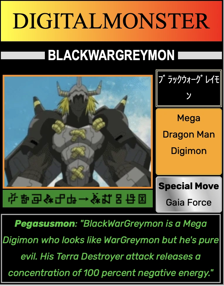 | ~ Pegasusmon describing BlackWarGreymon on the Digimon Analyzer. |