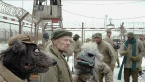 In the 2014 film Muppets Most Wanted (released 15 years after), he is seen alongside with his friend Black Dog as a gulag prisoner of Gulag 38B. In this second appearance of his, Pew does not have both of his eye-patches with him.