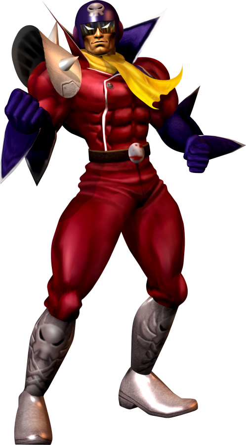 Blood Falcon bears a huge resemblance to Captain Falcon himself. He, however, has a red outfit with gray boots. His helmet is purple with a silver skull in place of a falcon, and he wears purple gloves, a large collar, a brown belt with a gray buckle, a large metal shoulder-guard, and a yellow scarf.