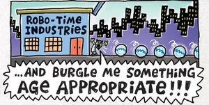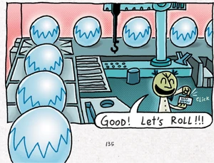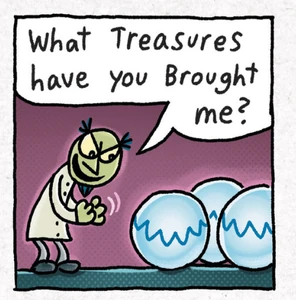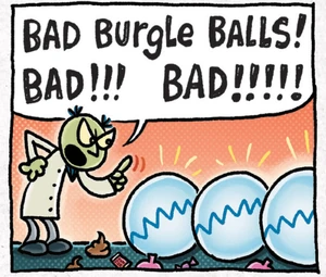 One of the Burgle Balls stole diamonds from Bud's Jewelry Shoppe. Another stole cash from First Bank of Frank. Another stole skateboards from Sk8 "R" Die. One stole candy and gum from Cavity King Candy (and Gum). One stole fake doo-doo and whoopie cushions from Mr. Fun's Jokes 'N' Gags. Dog Man went to try and stop one, but got scared, so he ran to a nearby trash can and hid in it. Then, the Burgle Balls came back to Dr. Scum, who was mad at the things they stole and took them to go back to steal something more age-appropriate.