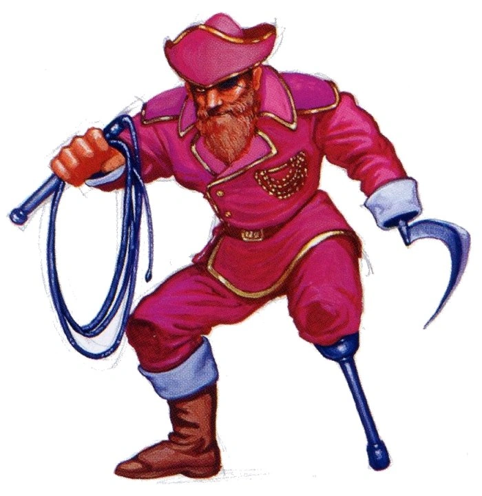 Captain Beard Jr. is proficient at using a long whip as his main weapon, being able to quickly whip away any soldier trying to jump into his escape ship as the Balrog was failing. He used the whip for long range attacks while attacking any approaching enemy with his hook hand. Captain Beard Jr. was of normal human skills, and as such not even close to a threat to Strider Hiryu, who killed him with ease.