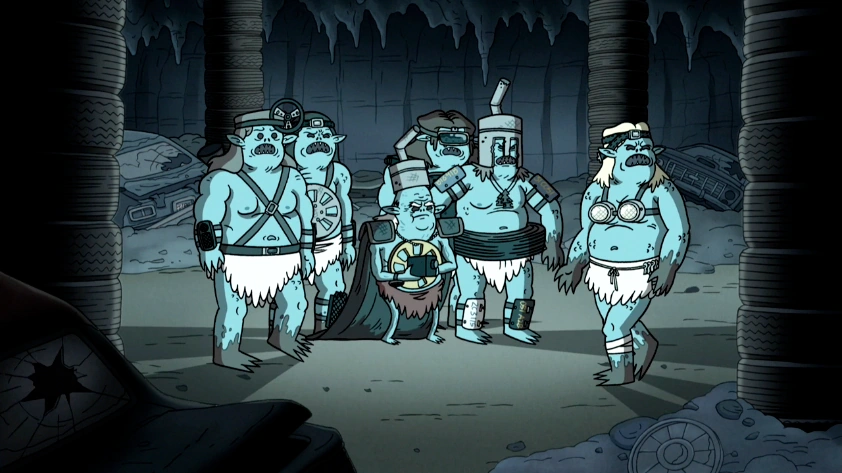 When Mordecai, Rigby, Muscle Man and Hi-Five Ghost crash their last car into the pit and record a video of it, they leave the camera in the car by mistake (although in a protective cage). By the time they go down the pit to retrieve it, the Carlocks have taken the camera and are watching the video, laughing and making fun of a scared Rigby jumping out of the car. The four enter their place and are caught as intruders. Mordecai explains they need the camera back, but the Carlocks refuse as it is their new and only source of entertainment and "Greatest gift of all." When the Carlocks mention "sky people", Rigby tells them there is no such thing and it was just them crashing cars into the pit. Since the Carlocks still refuse to give back the camera and laugh at him, Rigby attacks the leader and takes the camera. The groundskeepers escape using one of the crashed cars, and the Carlocks follow them. Rigby briefly distracts them with light from a flashlight, but the Carlocks soon chase them in cars and attack their car while trying to steal the camera. During the chase, two of the Carlocks fall into a deep pit. Above ground, Thomas is already filling the pit with dirt through an excavator and drops a load of dirt on one of the cars driven by Carlocks, causing it to explode. The Carlock leader jumps onto the groundskeepers' car and tries to grab the camera, but at that time Benson has Skips fill the hole using a dump truck. The Carlock driver's car gets hit by one of the falling pieces of dirt while the Carlock leader loses hold of the park workers' car and the park workers escape out of the pit before it is filled, while the remaining Carlock is buried in the dirt.