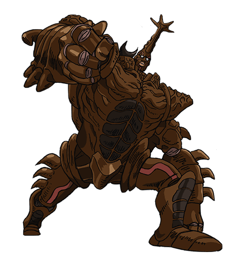 Carnage Kabuto is a massive dung beetle that is about 3 times over the height of Saitama and Genos. He has brown exoskeleton, a large horn on his head with a thick armor and spikes all over his body.