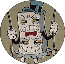 Pip and Dot are a domino swinging from a swing in a spike-filled room. They can spit spiked dice to hit Cuphead. Cuphead can use his parry on the pink dice. Sometimes, Pip will summon a Domino Bird from his hat, but it can be destroyed by bullet fire. The player must be constantly moving, as the room is moving and pulling them towards spikes. When defeated, Dot will kick Pip with her red heels, probably because she thought their loss was his fault.
