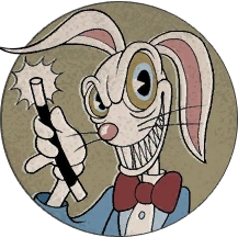 Hopus Pocus is a white rabbit in a blue tuxedo and bow tie in a black magician's hat, twirling a wand baton. He will use his magic to summon a circle of rabbit skulls to surround the player, which can only be escaped through a narrow gap. He will also conjure a series of card suits to fly across the screen; the player can parry the heart to avoid them. When defeated, he will be strangled by his own bow tie, which indicates that it has a mind of its own and is punishing Hopus for his failure.