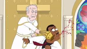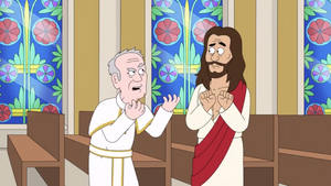 The Catholic Priest is a one-time villain from the Netflix original series, Paradise P.D., primarily appearing in the episode "The Father, The Son, and the Holy Post-It Note" and making a cameo appearance in the "The Brozone Lair". He is a greedy priest of a Catholic Church, who violently fought with The Legion of Dooooom over a bunch of money. His last and brief appearence in the season 4 premiere also reveals that like other corrupt Catholic clergymen he has molested children.