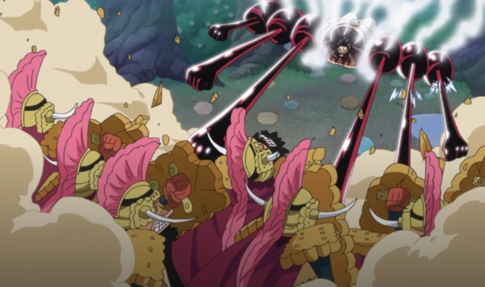 Luffy attacked Cracker but most of his attacks were blocked off by Cracker's shield, who manages to slam Luffy onto the ground with his shield. He then attempts to convince Luffy that Sanji would be happier leaving the Straw Hat Pirates and marrying Pudding. However, it angers Luffy who activates Gear Fourth and successfully lands a Gomu Gomu no Kong Gun on Cracker. After Luffy managed to destroy his puppet with another Kong Gun, Cracker emerged from it and nearly slices off Luffy's right arm with is sword Pretzel. He then reveals his true Devil Fruit abilities to Luffy, creating an army of Biscuit Soldiers as he believed that Luffy can never defeat him. As Luffy attacked the soldiers with Gomu Gomu no Kong Organ, Cracker came from behind and barely missed Luffy's head.