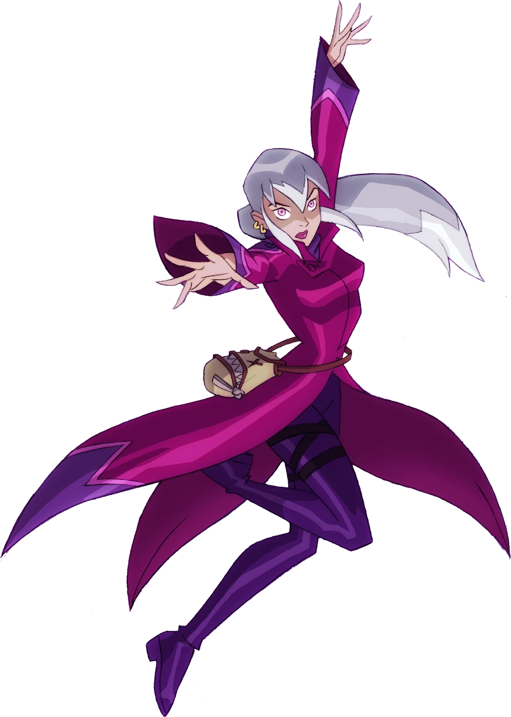 In the original series, Charmcaster wears a magenta coat with purple at the ends, underneath she wears purple pants with black straps around them. She still wears her Magical Charm Bag around her waist which is the main tool for her battles.