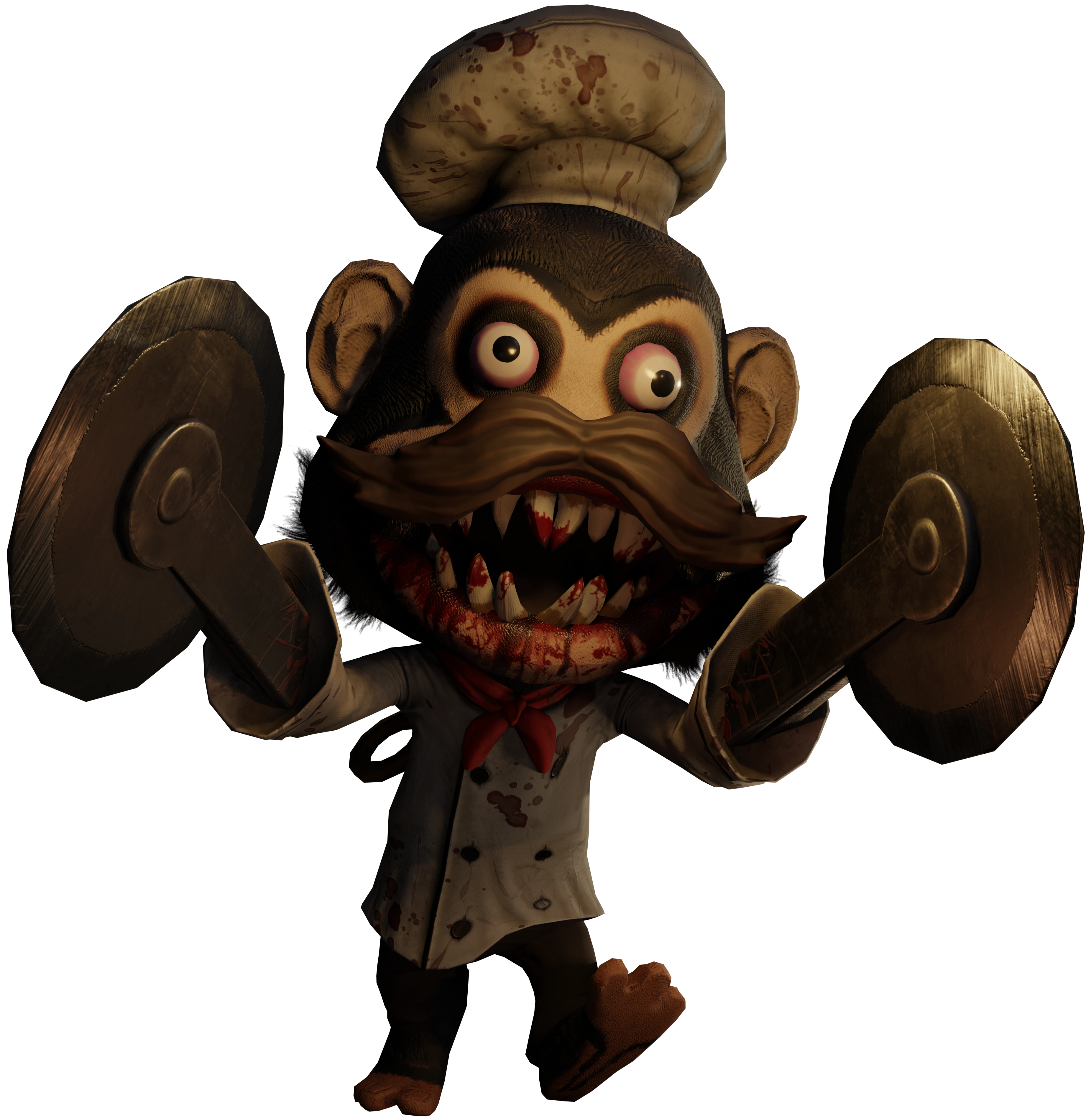 They are similar to the Murder Monkeys in appearance, however they are slightly larger and have bushy brown handlebar moustaches and wear stereotypical chef's outfits rather than bellhop uniforms. In place of knives, the Chef Monkeys instead have large, bloodstained pizza cutters where their hands would be.