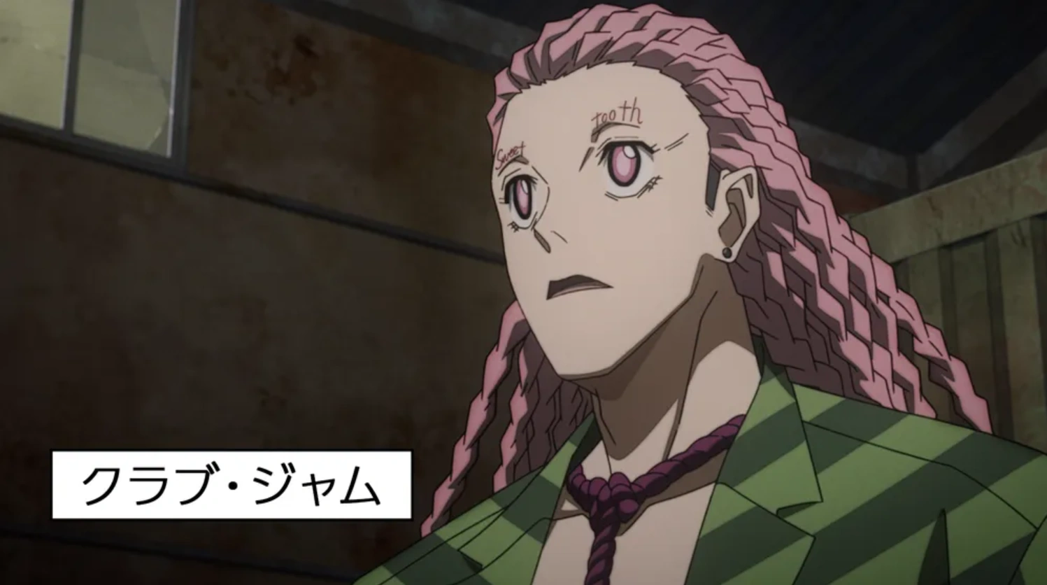 Club Jam is a towering man of muscular build with large pupiless lilac eyes with the word "Sweet" written above his right eye and "tooth" above his left one. His ears wear black earrings. Hie has black hair dyed as tied in numerous dreadlocks. His attire consisted of a green-stripped loose coat over red rops tied around his abdomen that gets exposed in X-shapes and black pair of pants and shoes.