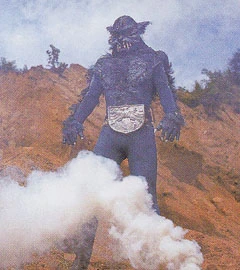 After Hayato and Kazuya infiltrate the party Zol was holding between Shocker executives, Zol assumes his Wolf Man kaijin form to confront the Rider himself. After a lengthy battle, Wolf Man was toppled off a cliff and destroyed by Kamen Rider #2.