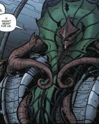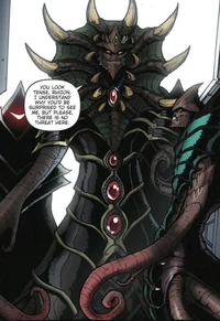 Rhizon is a Cryog commander. When the Cryog homeworld was destroyed by King Ghidorah, Rhizon led the search for a new habitable planet. Rhizon is ruthless and scheming, immediately intending to wipe out mankind and to betray the Devonian, however he seems to genuinely care for the wellbeing of his race. When Karkaro took over the invasion from Rhizon, Rhizon actively worked against him and helped ensure the invasion would fail.