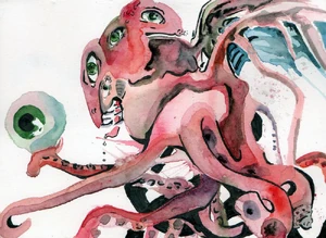 Cthylla was not physically described by Lumley, but was featured in Tina L. Jens's short story In His Daughter's Darkling Womb. Cthylla has the appearance of a gigantic, red-bodied, black-ringed, and six-eyed octopus with small wings. Like her father, she is able to alter her body proportions at will, such as by enlarging her wings to enable her to fly. While she normally has eight arms like any octopus, she can extrude or retract additional ones at will (she has been known to sport as many as twelve arms). Each arm is equipped with dozens of razor sharp claws, each about five inches in length.