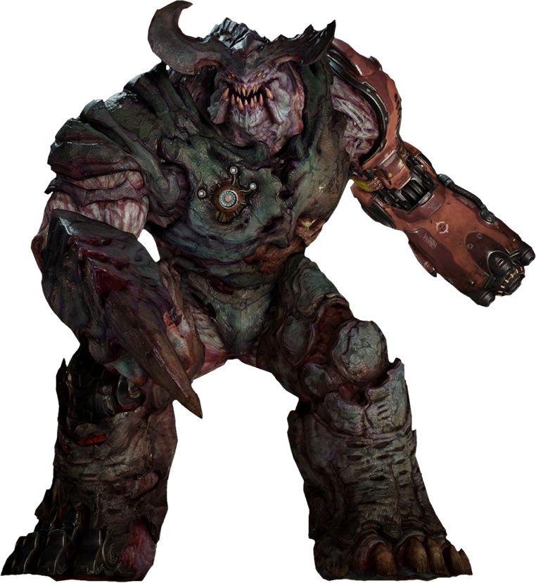 He is one of the most powerful and infamous demons. As his name suggests, he is a large bull-like demon with robotic parts, such as a giant gun for a hand. It is a tall, muscular, minotaur-like beast with two dark black/gray horns, a cybernetic right leg, a large rocket launcher mounted on its left arm, red wiring on its lower torso, as well as patches of metal and wires on its right arm.