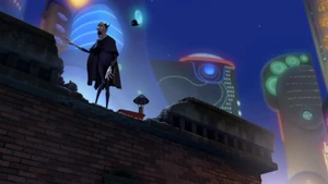 DOR-15 kills Carl before he can take Lewis, Wilbur and the Memory Scanner to the safety of the Robinsons' house.