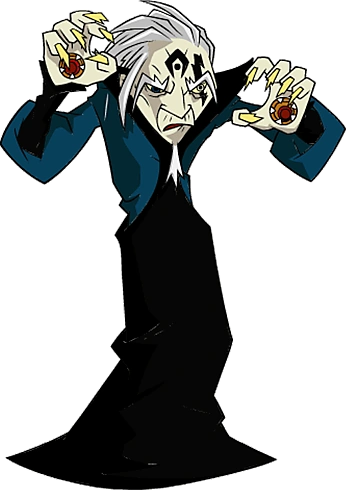 Daolon Wong is a thin elderly man with fair skin, long gray hair, a gray beard, and long broken fingernails. In his palm are circular demonic jaws used primarily to extract chi from other magical beings. He wears a black robe with pointed shoulders, and a turquoise shirt underneath. He wears a black robe that covers his torso and upper arms, and his forearms. His legs are often hidden under a long robe, but he wears blue shoes.
