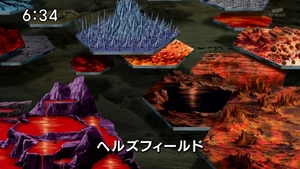 - Hell's Field (ヘルズフィールド, Heruzu Fīrudo): A dangerous wasteland which is a literal hell that resides beneath Bright Land. It is Lord Bagra's hell, which means that evil Digimon are actually empowered there, while good Digimon are weakened. There are many floating islands floating above a vast plain, and the islands contain such hazards as a lake of acerbic fluid that eats away at data and a field of spikes made out of the "hardest metal", as well as a black and white castle. The castles are part of the Hell's Field program, which is controlled by Apollomon: opposing armies are set in each castle, and a black or white rose emblem is placed on the lead general of the respective army. The exit to Hell's Field remains sealed until one of the roses transmits a signal recording its general's death to both castles. After Whispered revealed himself, he dropped the Xros Heart United Army into Hell's Field, where Taiki was set as the general of the Xros Heart United Army at the white castle, and Yuu was set as the general over the Twilight Army as well as Apollomon's forces at the black castle. Although Taiki managed to lead his army to victory, he was unwilling to kill Yuu to escape, and so allowed Wisemon to simulate his death in order to make the rose send off the death signal to the castles. Meanwhile, Apollomon digixrosed the defeated Lilithmon and Blastmon into Lilithmon (Monster), allowing them to absorb all the energy of Hell's Field and eventually annihilating it in a massive explosion.