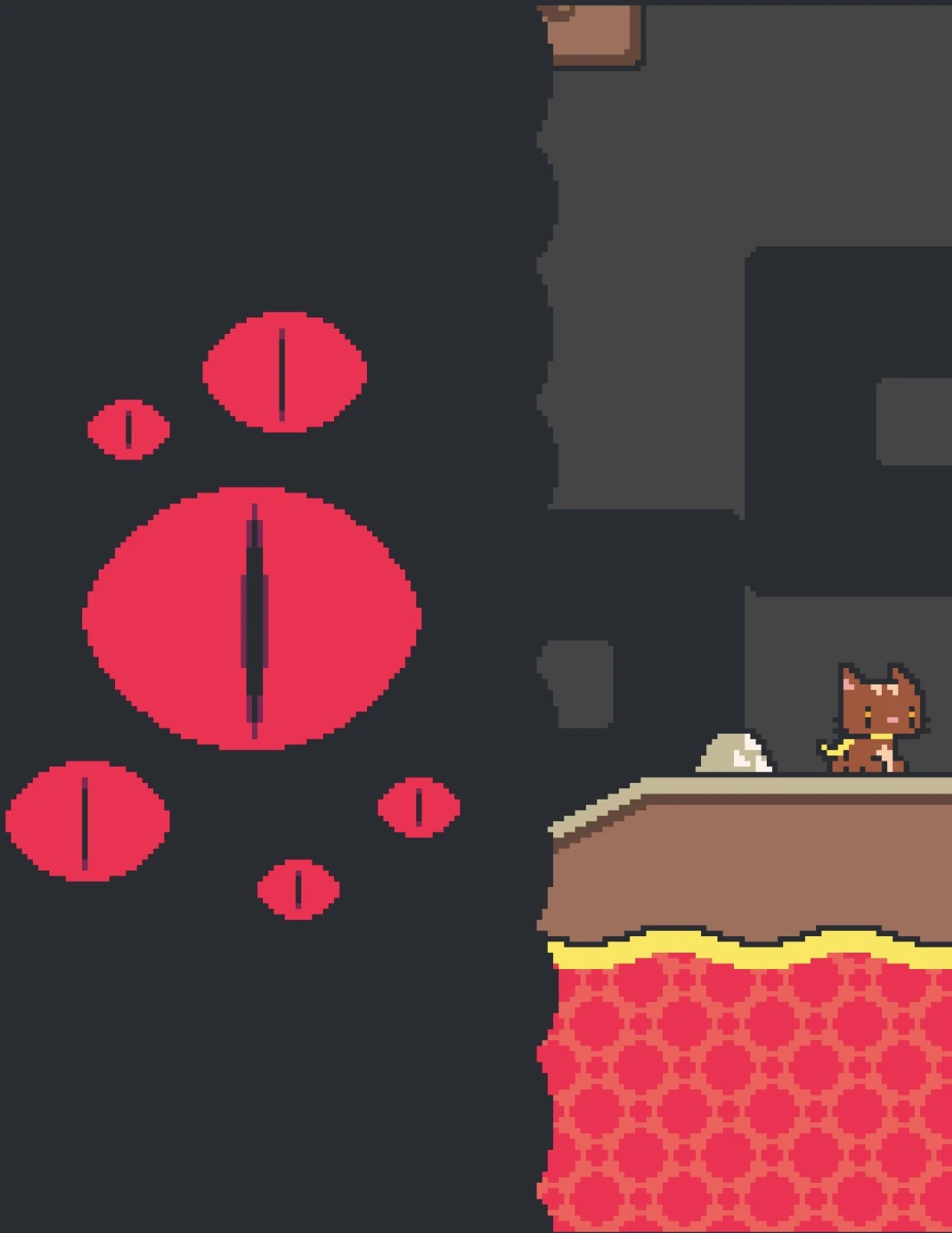 Dark Matter is the final boss of Super Cat Tales, it is a giant wall that chases the cat and follows them in the level "Reach the Light". There will be multiple obstacles such as lava bars and Flame Jumpers. Once you reach the light, Dark Matter's pupils will become smaller, it will start to back away and "explode".