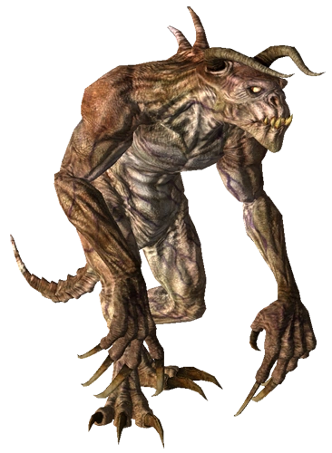 They get their namesake from their huge claws, which they use to kill and dismember any prey they happen to find. The hands of the Deathclaws are large and they use it to quickly swing across the air to take down enemies, they sometimes even grab their victims and then use their claws to finish them of. The legs are long and thick making them fast runners that have two sets of knees, one going forward and one going backwards. On their head are two separate horns extending from the left and right side. Similarly, to that of a goat. The mouths are large and rigid with numerous uneven yet sharp teeth. The eyes are small and lack irises but are capable of good sight. The color is either completely white or orange.