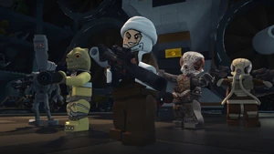 As Jas returned and reunited with her friend Norra Wexley and the B1 Battle Droid, Mr. Bones at Niima's temple. Dengar and the other hunters, however, tracked Jas there and cornered both her and Niima with the latter having promised to provide Jas and Norra with Imperial uniforms, an Imperial shuttle, and clearance codes to enter the main Imperial base on Jakku out of gratitude for ferrying her back to her temple. Niima had initially refused to hand Jas over and grabbed Swift by the neck until Dengar held his blaster at the hutt and forced her to let go of Swift and she dropped him to the ground alive and well. While the hunters were preoccupied, both Norra and Bones escaped on the Imperial shuttle.