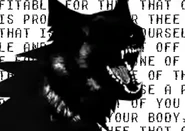 Dogtooth looking where the letters and music is coming from, spotting the Puppet God.