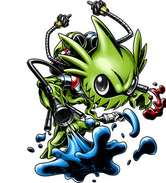 Drawmon is a green slime-like creature with a paint bottle as a tail.