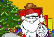 Most of his fragments and sketches in the episodes he stars, does nothing more than complain about his work as the Christmas figure, mistreating the children who gave them their gifts of very poor quality, showing little enthusiasm for their work .Living in a deplorable situation inside his cabin in the north pole, not to say that his workshop of gifts is in bank broken for lack of budget.