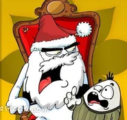 The Egg Santa, also known as the Huevo Santa in Spanish, is an antagonist in Huevocartoon. He is a bitter and serious egg that gives bad gifts of low cost to the children because, according to him, they never behave well. He has never entered the fireplace when he presents gifts. In his workshop, his assistant elves do not work. Only one reindeer looks hungry, being Rudolph.