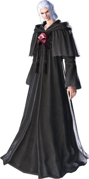 In Endwalker, Emet-Selch is shown with his true form as an Ancient. He has medium length white hair, golden eyes, and wears a black robe that has his mask - colored red and white - resting on his chest.