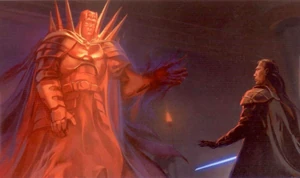 He engaged Keto and easily defeated her, before taking on Qel-Droma, but neither one could beat the other. However, the energies from the two Sith amulets united to give a message from the ancient Sith Empire spoken by Marka Ragnos, who told them to stop fighting.