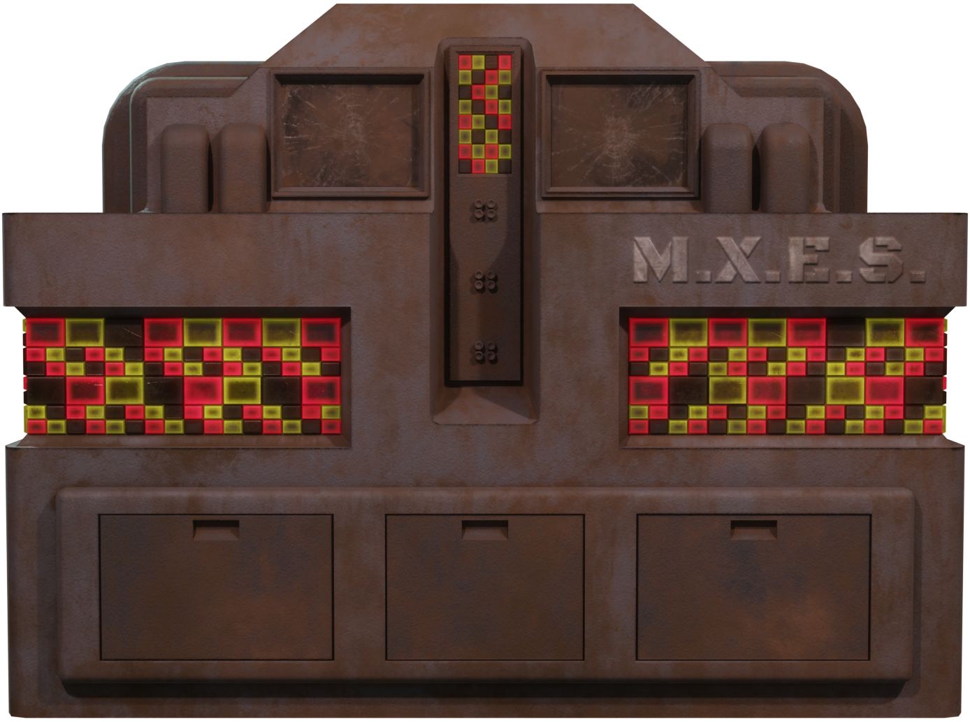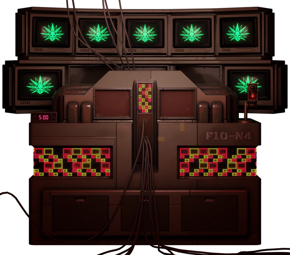 M1 originally inhabited M2's first endoskeleton. As F10-N4, she's a giant server box with multiple screens and hatches along her surface, with red and yellow grids flickering across her structure.