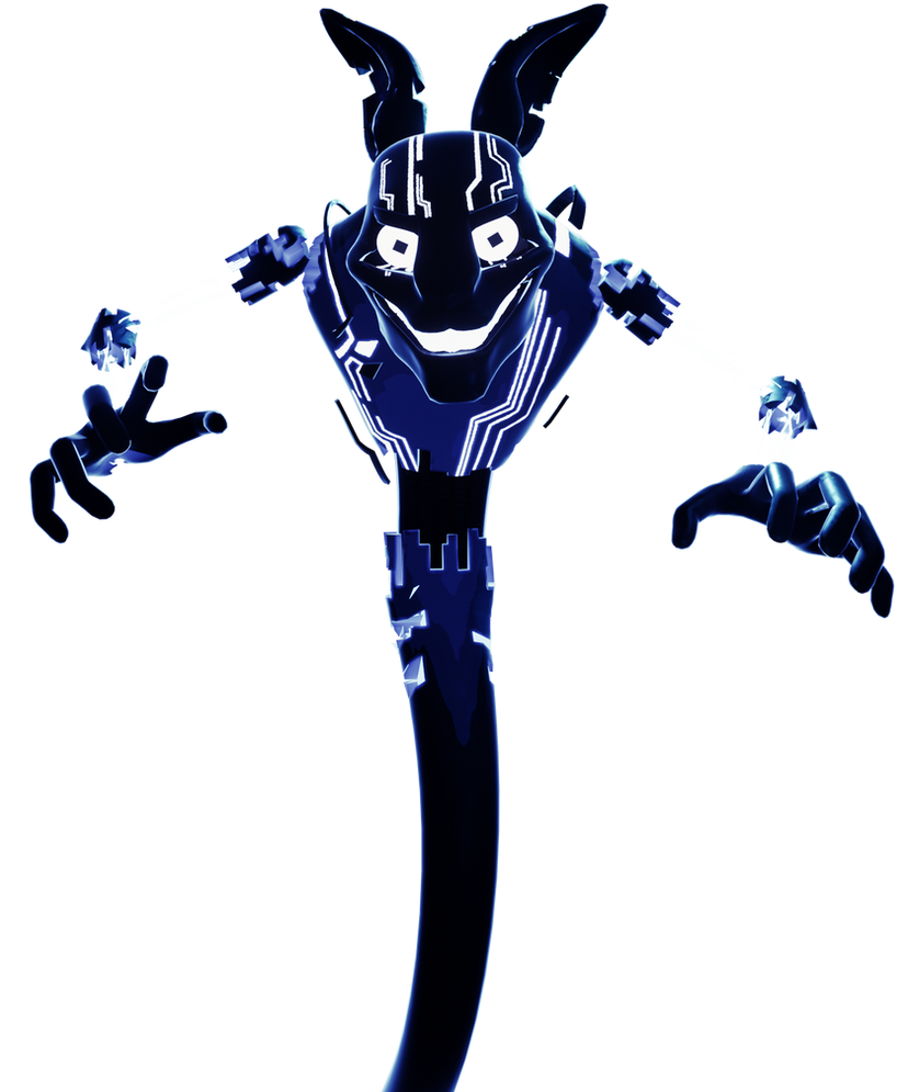 The Entity is a glitchy, noncorporeal rabbit animatronic with five long fingers. It lacks legs and instead has a levitating, cylindrical "tail". It has no arms, with its shoulders, elbow joints and hands being connected by electricity. M.X.E.S is dark blue in color with white circuit-like markings and purple glitches all over its body. Its head is a mixture between humanoid and rabbit-like, with square eye sockets containing circular eyes. Its pupils are squared and black.